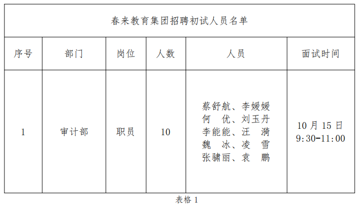 1.面试时间:10月15日9:30-11:00。具体安排详见下表:春来教育集团招聘初试人员名单。